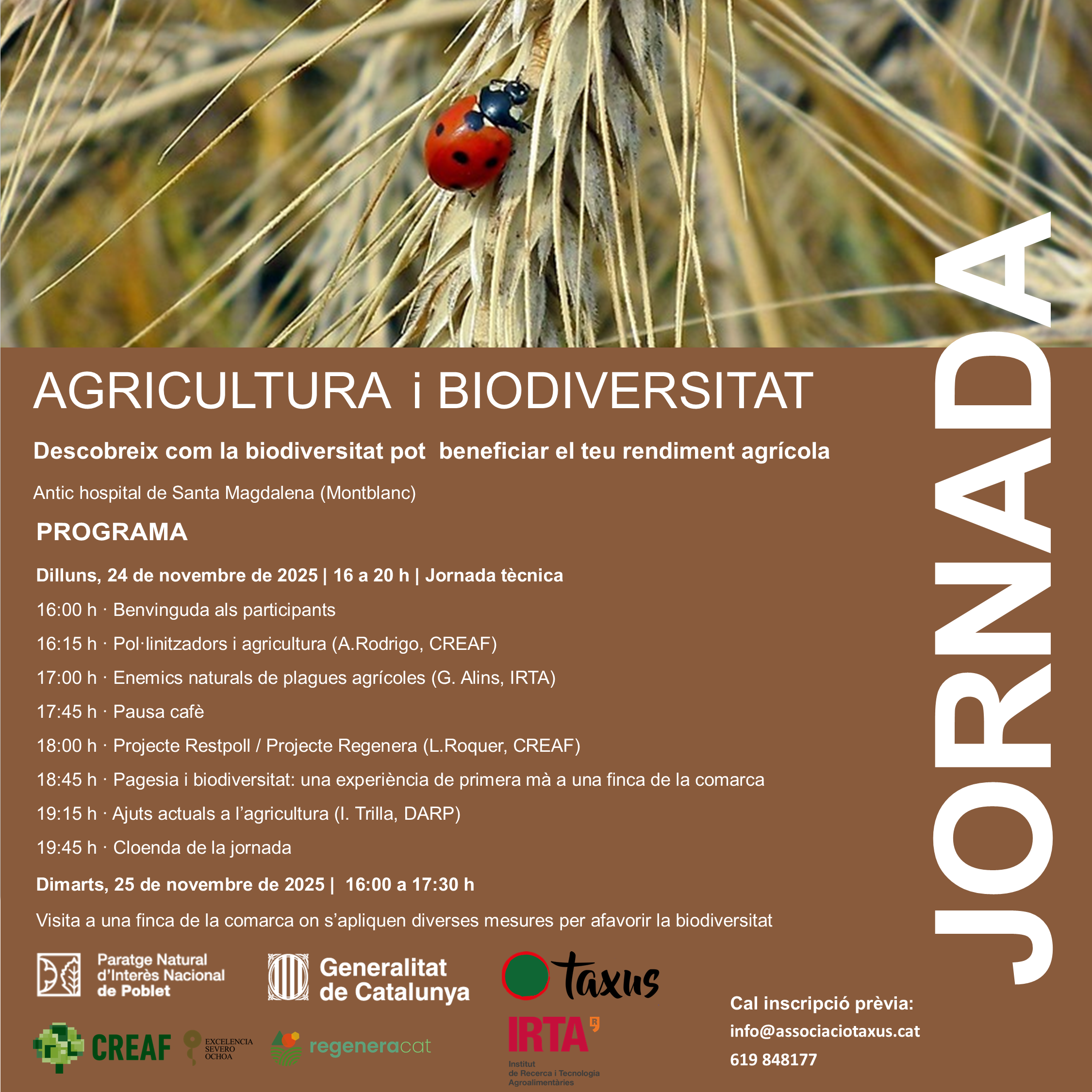 Quan: 24 de novembre a l’antic hospital de Santa Magdalena de Montblanc i 25 de novembre visita a una finca de la comarca on s’apliquen diverses mesures per afavorir la biodiversitat.