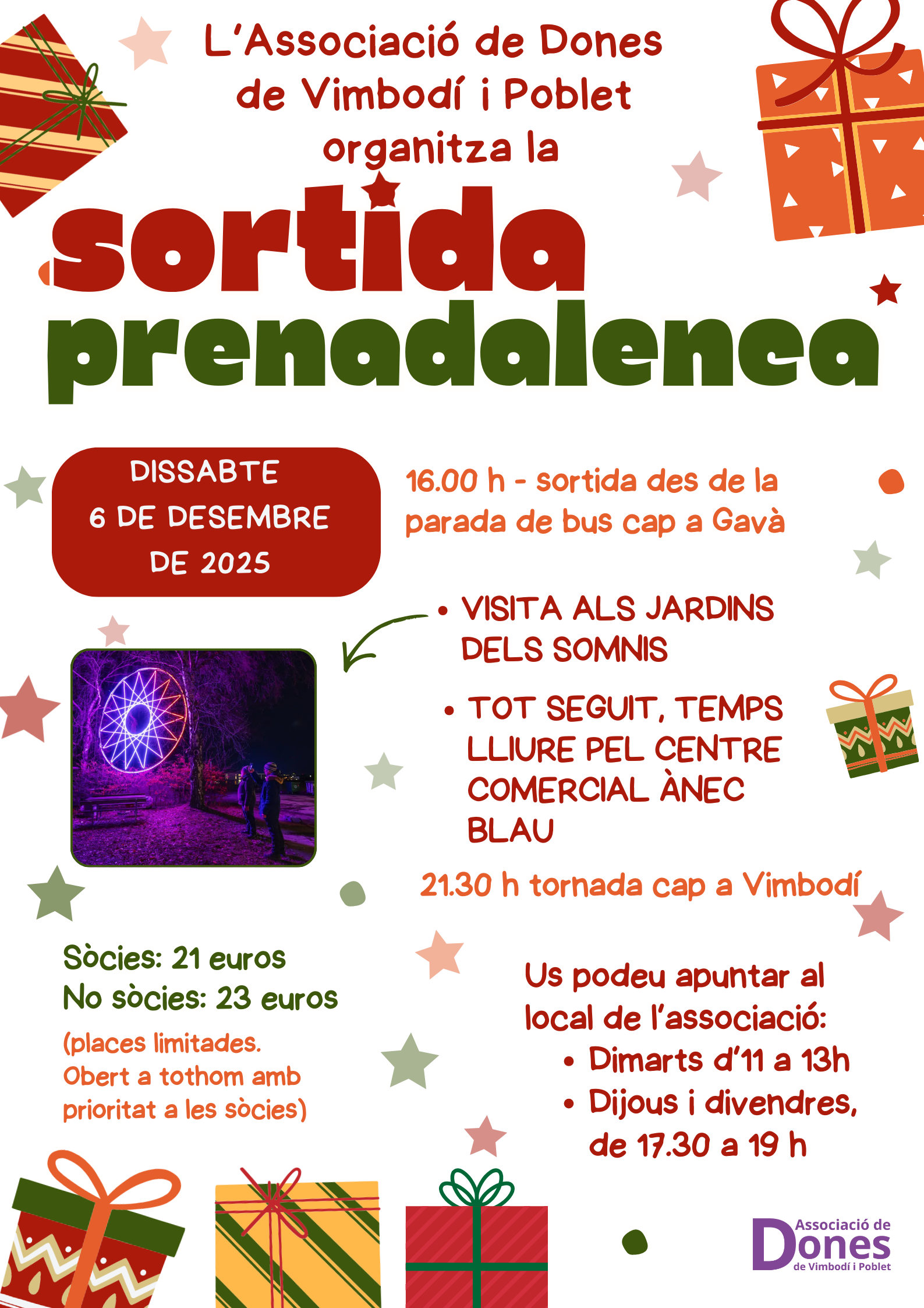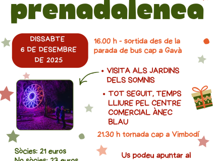 L’Associació de Dones organitza la tradicional sortida prenadalenca pel proper dissabte 6 de desembre. Es visitarà els Jardins dels Somnis de Gavà i després hi haurà estona de temps lliure al centre comercial Ànec Blau.