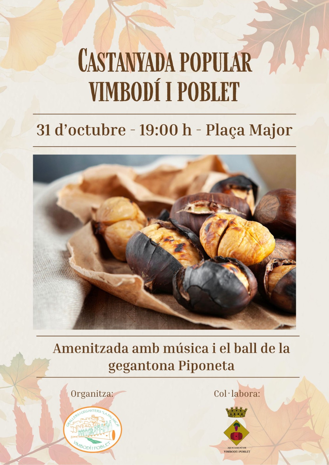 Divendres 31 d’octubre, a les 19 h, a la plaça Major, celebra la Castanyada a Vimbodí i Poblet acompanyat de la gegantona Piponeta i del grup de grallers La Palanca.