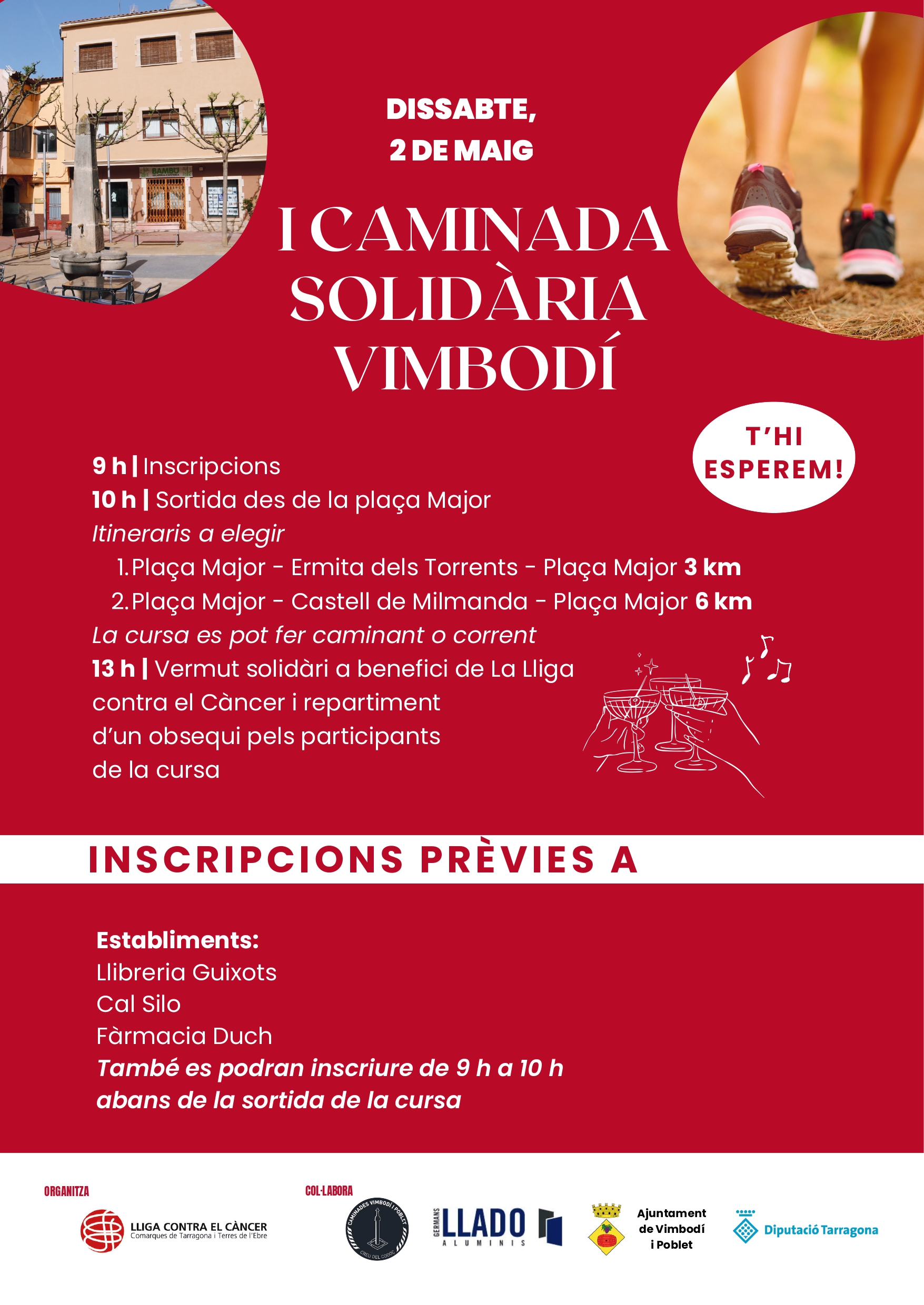 La delegació de Vimbodí i Poblet de la Lliga contra el Càncer organitza la I Caminada Solidària Vimbodí aquest dissabte 2 de maig.
