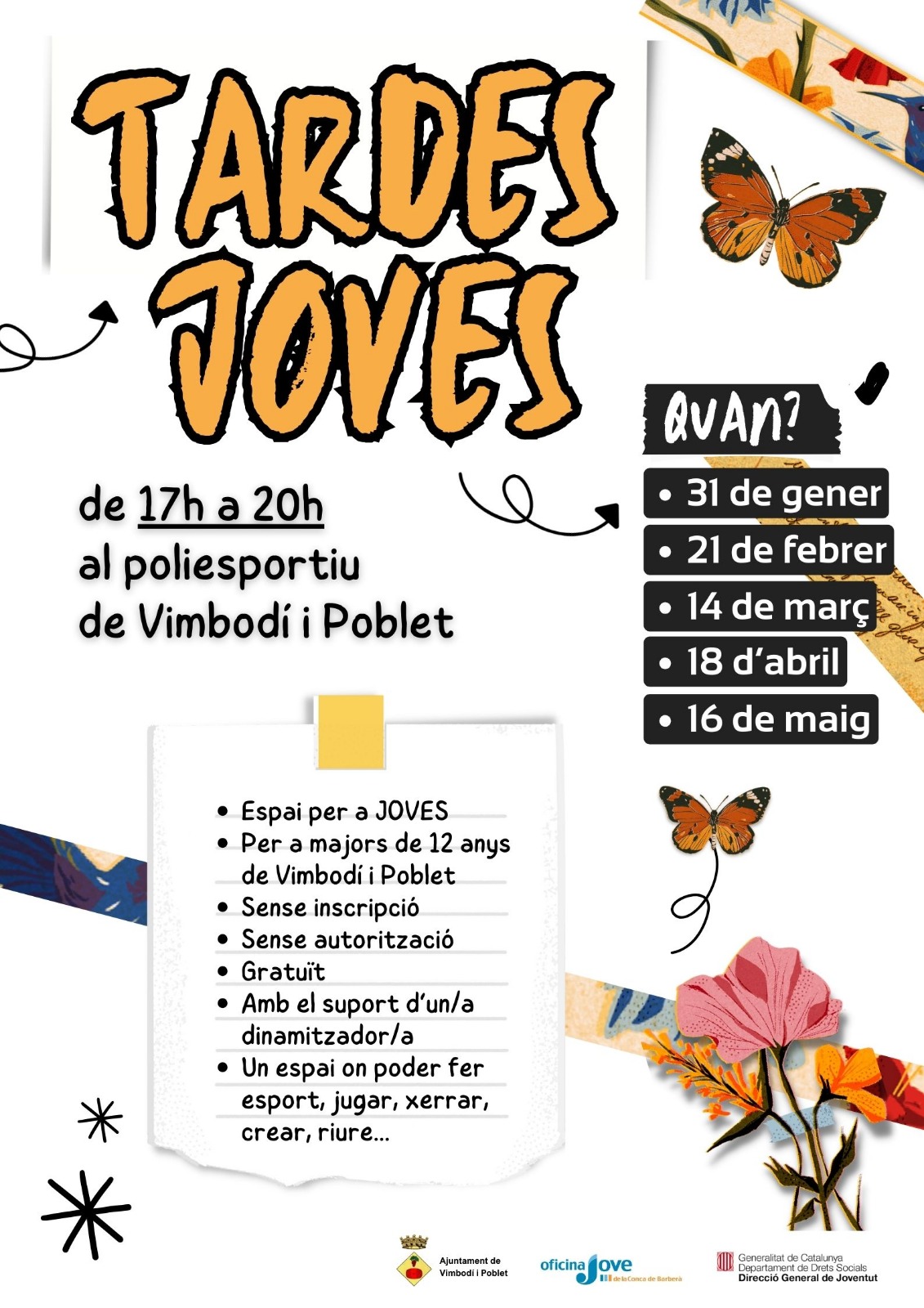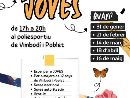 L’Ajuntament de Vimbodí i Poblet reemprèn el projecte Tardes joves. Passem la tarda, un espai on els joves a partir de 12 anys poden fer esport, jugar, xerrar, crear... De fet, són els mateixos joves els qui decideixen què fer durant la tarda i proposen què els agradaria fer el mes següent.