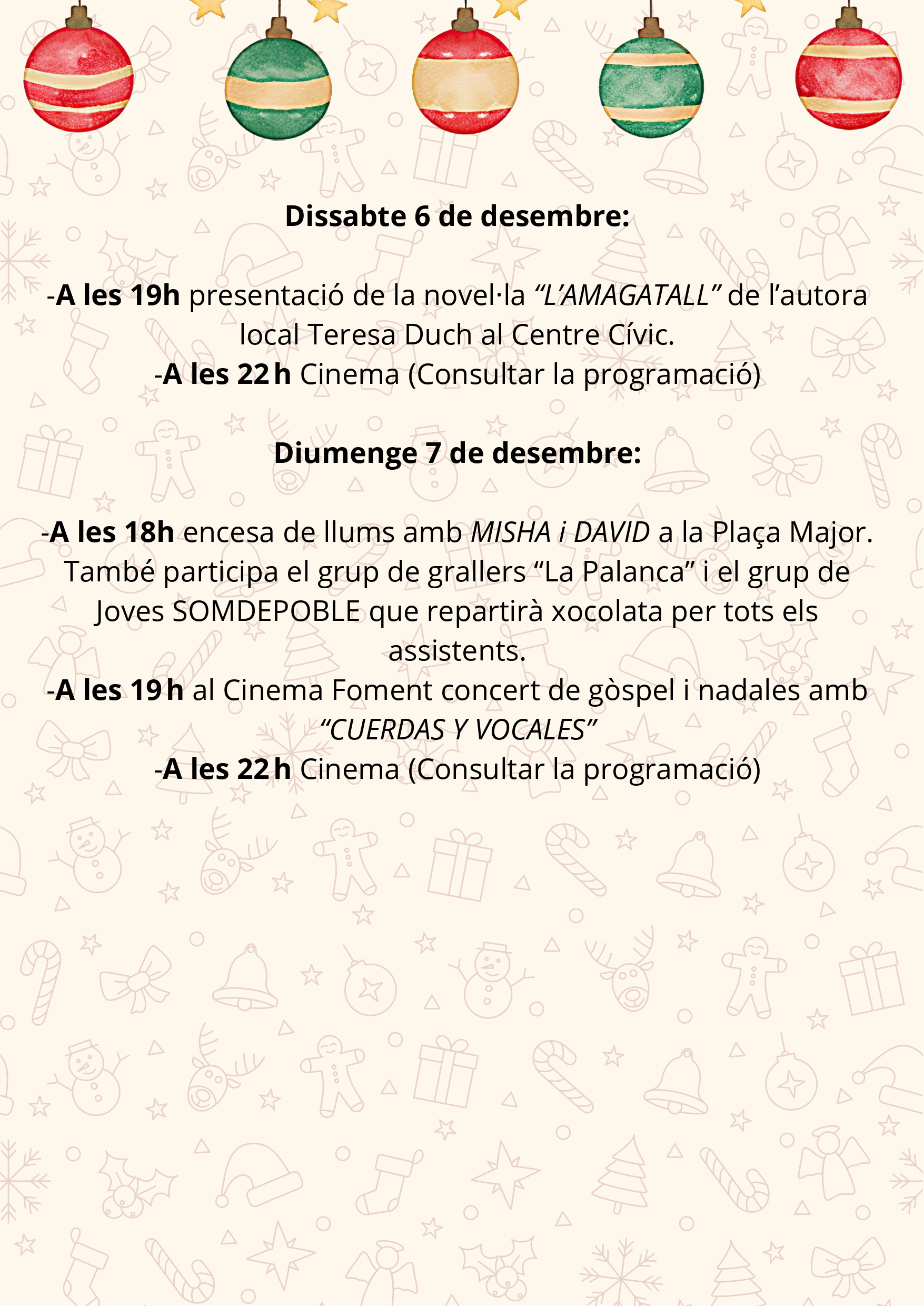 - 18 h-Encesa de llums amb Misha i David a la Plaça Major, amb els grallers La Palanca i el grup de joves SOMDEPEPOBLE, que repartiran xocolata per a tothom.
