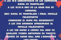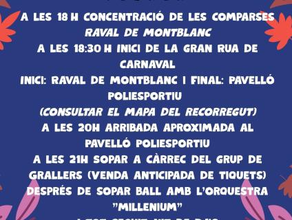 La jornada començarà a les 18 h amb la concentració de les comparses al Raval de Montblanc, i a les 18.30 h s’iniciarà la gran rua de Carnaval. El recorregut començarà al Raval de Montblanc i finalitzarà al Pavelló Poliesportiu, amb una arribada aproximada prevista cap a les 20 h.